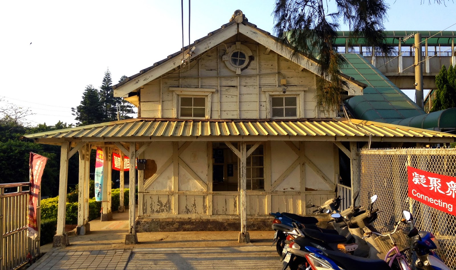 【夕陽灑落在新埔車站,左側的木柱是否有點傾斜?】