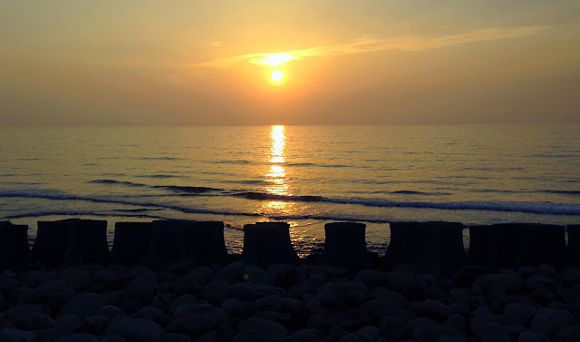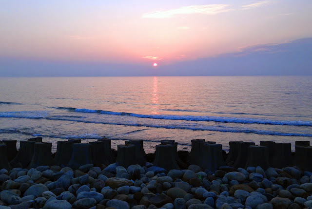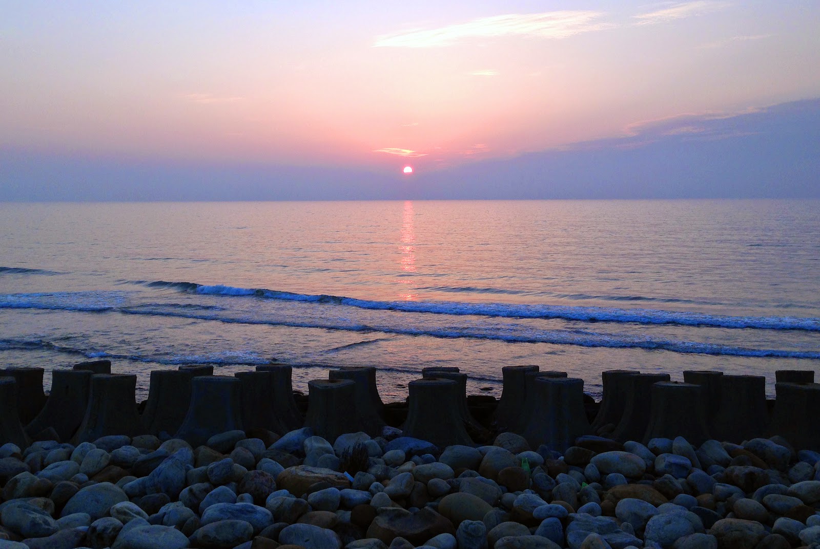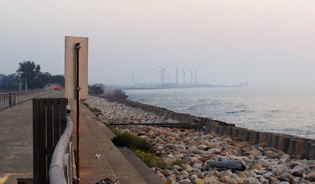 一如尋常的西海岸景色,堆滿了消波塊,海呈現一種不乾脆的灰藍色
